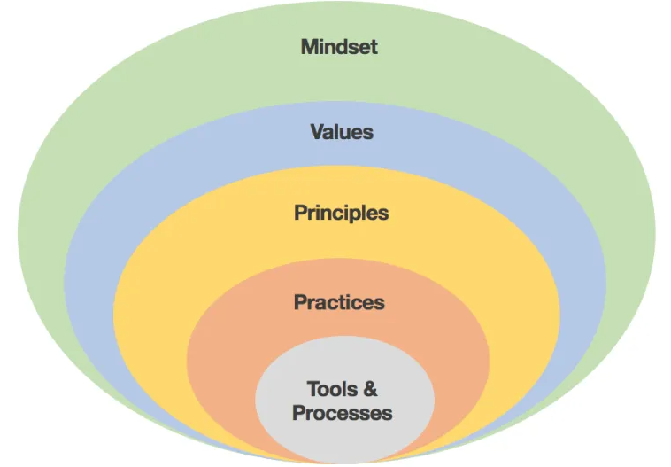 Pero me gustaría que nos detuviéramos en la esencia, en examinar en detalle los valores y principios del manifiesto para ver si los cumplimos o no, pues ello es lo que realmente va a dictaminar el que dispongamos de una mentalidad ágil. No obstante, es ahí donde reside el verdadero impacto organizacional y no tanto en las prácticas, tal y como exponía Simon Powers en su conocida Agile Onion.